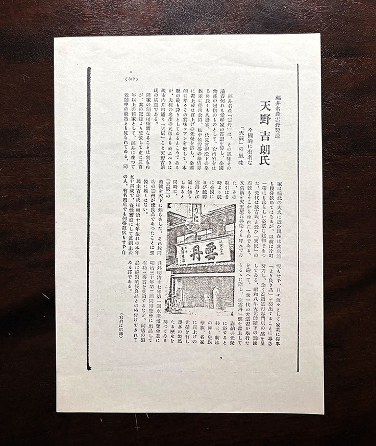 創業から二百年を数える天たつ福井片町本店。先々代にあたる天たつ九代目、天野吉朗の新聞などの切り抜きから、ひとつ、天たつの謂れをお話いたします。