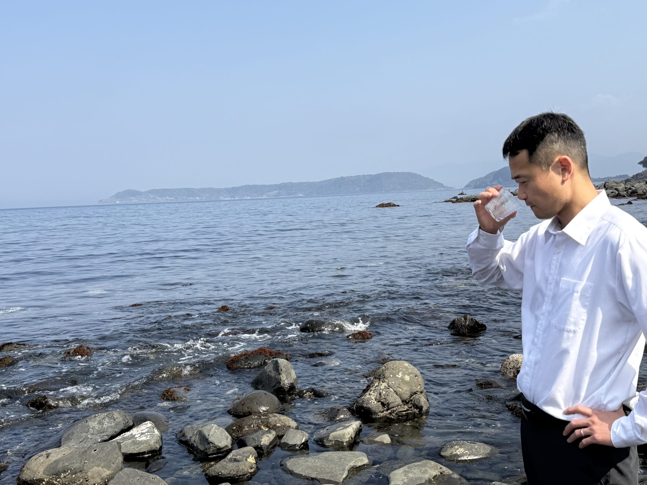 ウニの味わいが産地によって違うのは海水の違いから育まれる海藻が違うことが大きな要因であるため、道中その浜ごとの海の違いを知るために、海水を飲みながら進みます。