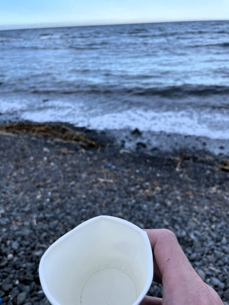 実はさっき利尻にも寄ってきたんですが、利尻の海水は逆に、えぐみや苦みがまったくなくて、磯の香りがふわりと漂い、とても柔らかい印象でした。浜の近くだったので、その香りも影響しているのかもしれませんが、とても甘く感じられて、改めて「海によって全然味が違うんだな」と感じました。