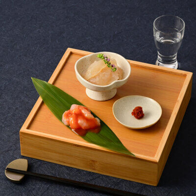 天たつの「越前仕立て汐うに」は、江戸時代より伝わる塩蔵法にてバフンウニの卵巣と塩だけで仕上げており、ねっとりと濃厚な味わい。酒肴にこの上ない贅沢な一品です。「もみわかめ」は海から上げたわかめそのままの程よい塩気と磯のさわやかな香り。わかめの旨味がご飯をご馳走にします。福井独特の銘菓でそら豆を油でカリカリに揚げ、ウニをまぶした豆菓子「うに豆」とともにお楽しみください。